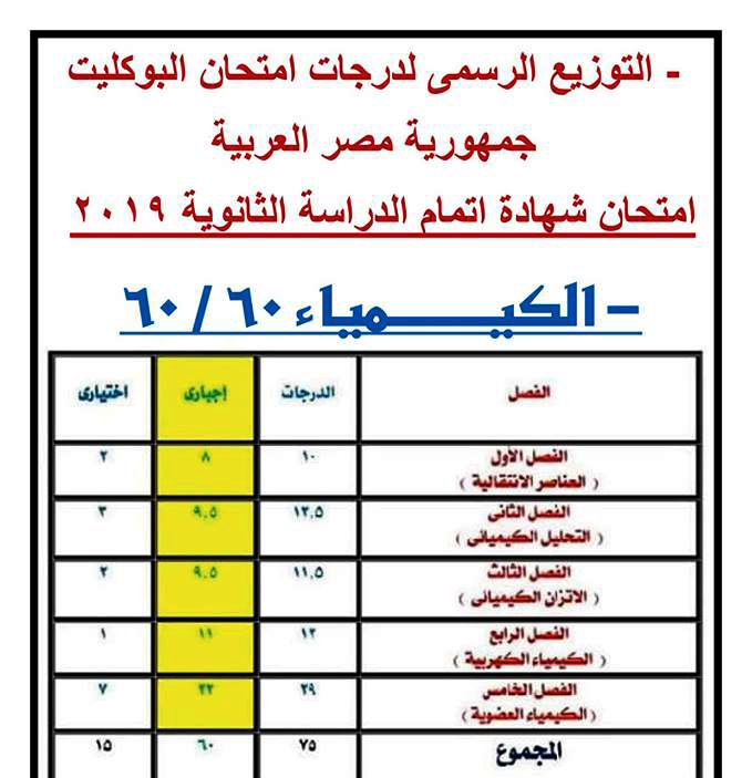 تقسيم توزيع درجات الكيمياء للصف الثالث الثانوى 2019 في مصر درجة النجاح للثانوية العامة